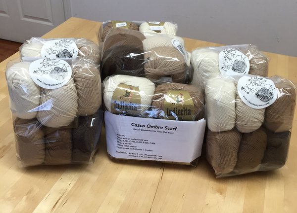 Each kit includes the Cuzco Ombré Scarf knitting pattern as well as 6 colors of DK weight 100% Peruvian baby alpaca yarn.